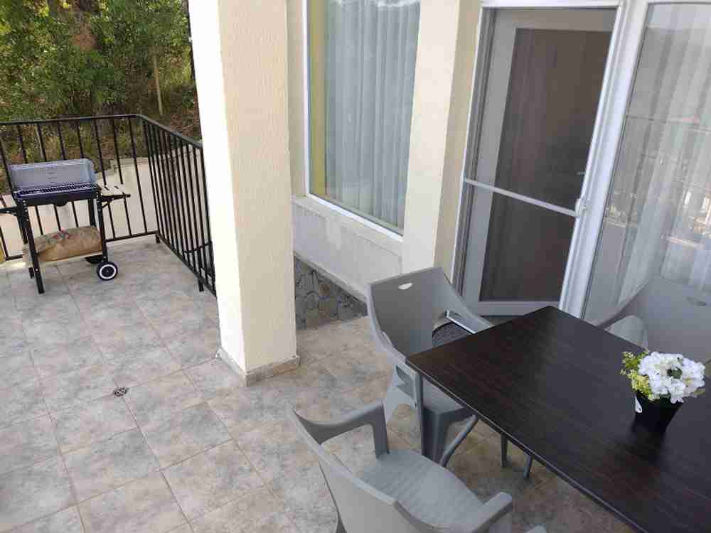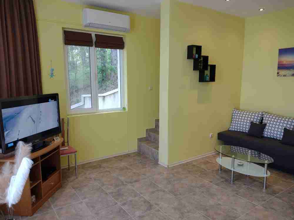 На първи етаж е разположена голяма спалня, обзаведена с двойно легло, скрин, телевизор и самостоятелна баня с тоалет. Дневният тракт и кухнята са разделени на кътове - мека мебел, трапезария и кухня. Кухнята е напълно оборудвана с всички необходими удобства и ел. уреди – фурна, котлони, микровълнова печка, кафе-машина, тостер, кана за вода, хладилник, пералня, аспиратор, посуда и прибори. Дневната зона е обзаведена с разтегателен диван, интериорна масичка и телевизор. На същото ниво е разположена спалня с две единични легла, гардероб, дъска за гладене и ютия. Вътрешното стълбище отвежда към трети етаж с 2 спални. Голямата спалня разполага с двойно легло, скрин, телевизор, климатик, самостоятелен санитерен възел и панорамна тераса. Другата спалня е обзаведена с две единични легла, гардероб и отново отделна баня с тоалетна. Този апартамент предоставя всички удобства на градската среда и в същото време усещането за къща, спокойствието и чистотата на живота извън големия град.